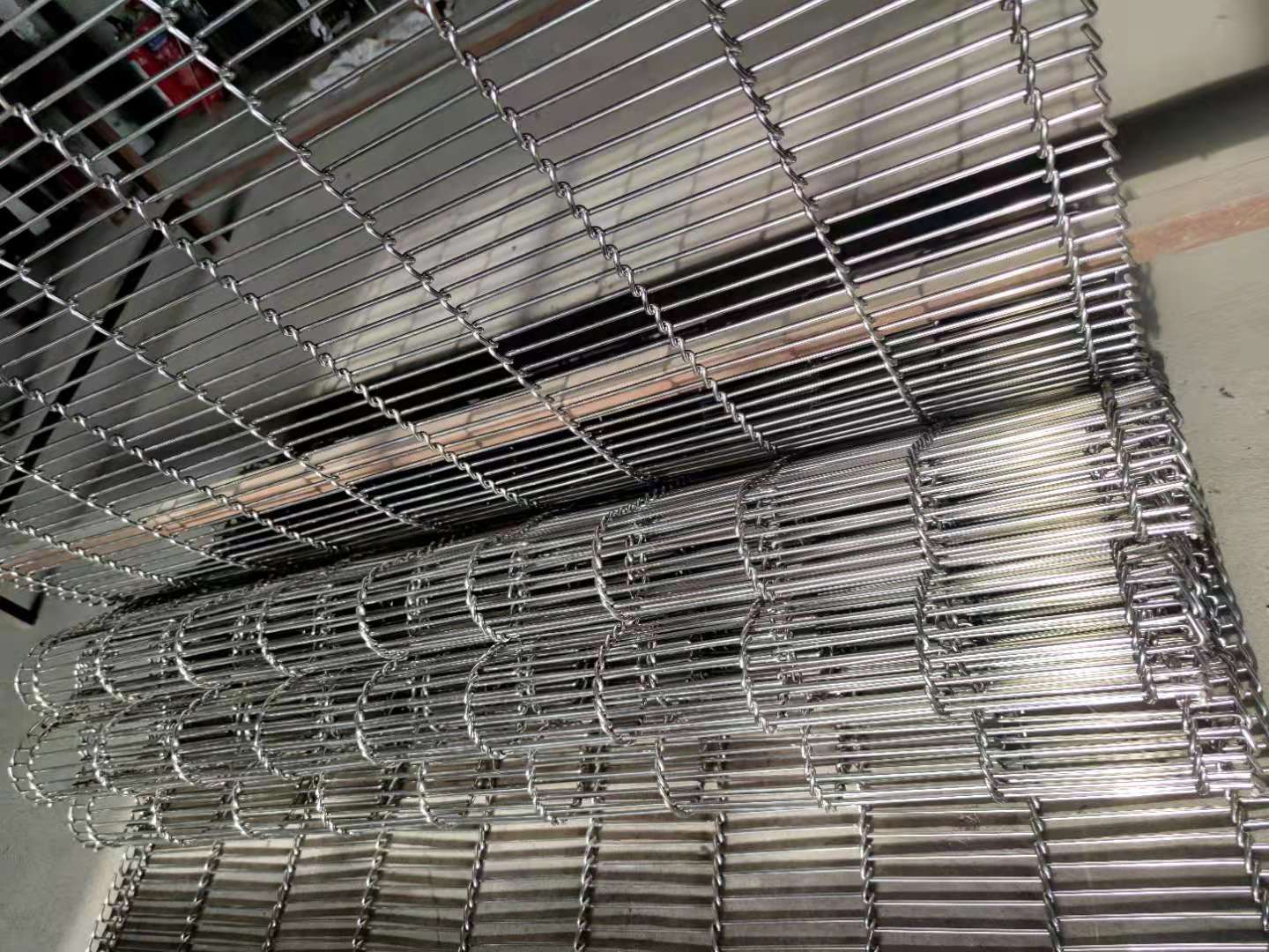 用于自動(dòng)化地板涂裝生產(chǎn)線(xiàn)包括地板烘干回火線(xiàn)、流平機(jī)、輥涂線(xiàn),使用鏈條型網(wǎng)帶,網(wǎng)帶使用穿絲繞絲編織,兩邊焊接不銹鋼鏈條,網(wǎng)帶中間添加不銹鋼隔套,可以減少摩擦力防止刮蹭,更益于地板的生產(chǎn)和品質(zhì)。